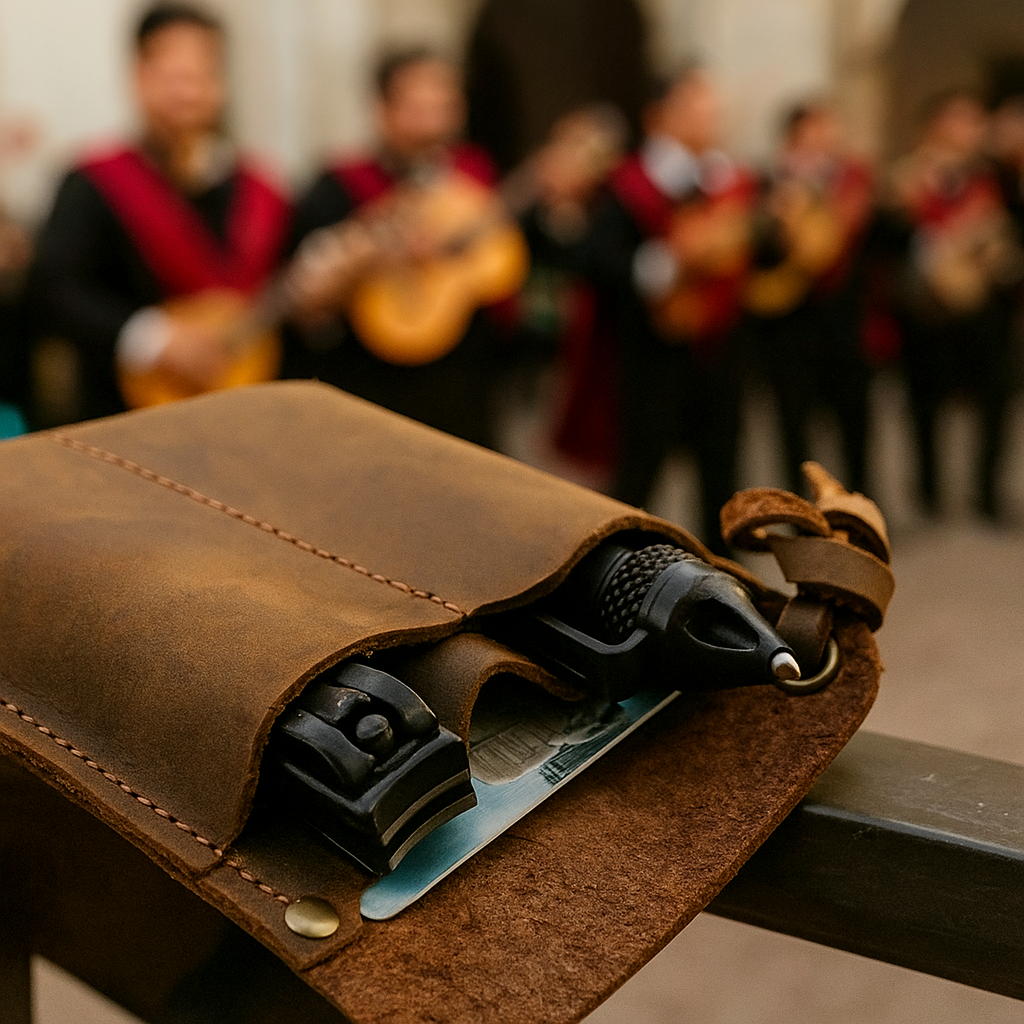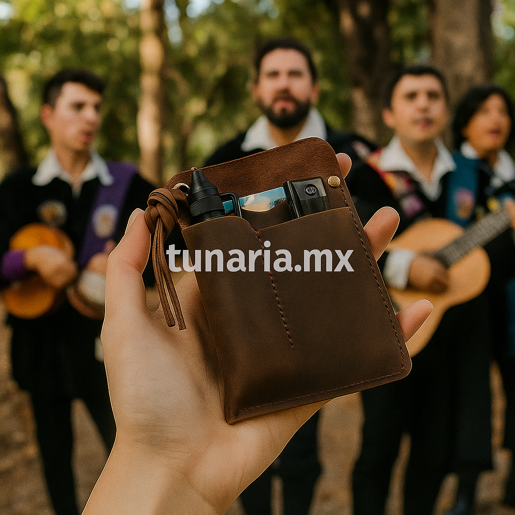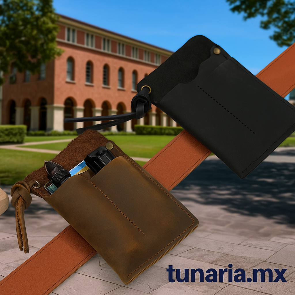 Lleva tus artículos esenciales siempre a mano con esta elegante funda de cuero. Ideal para la pardibolsa o para el Tuno práctico que nunca le falta nada.